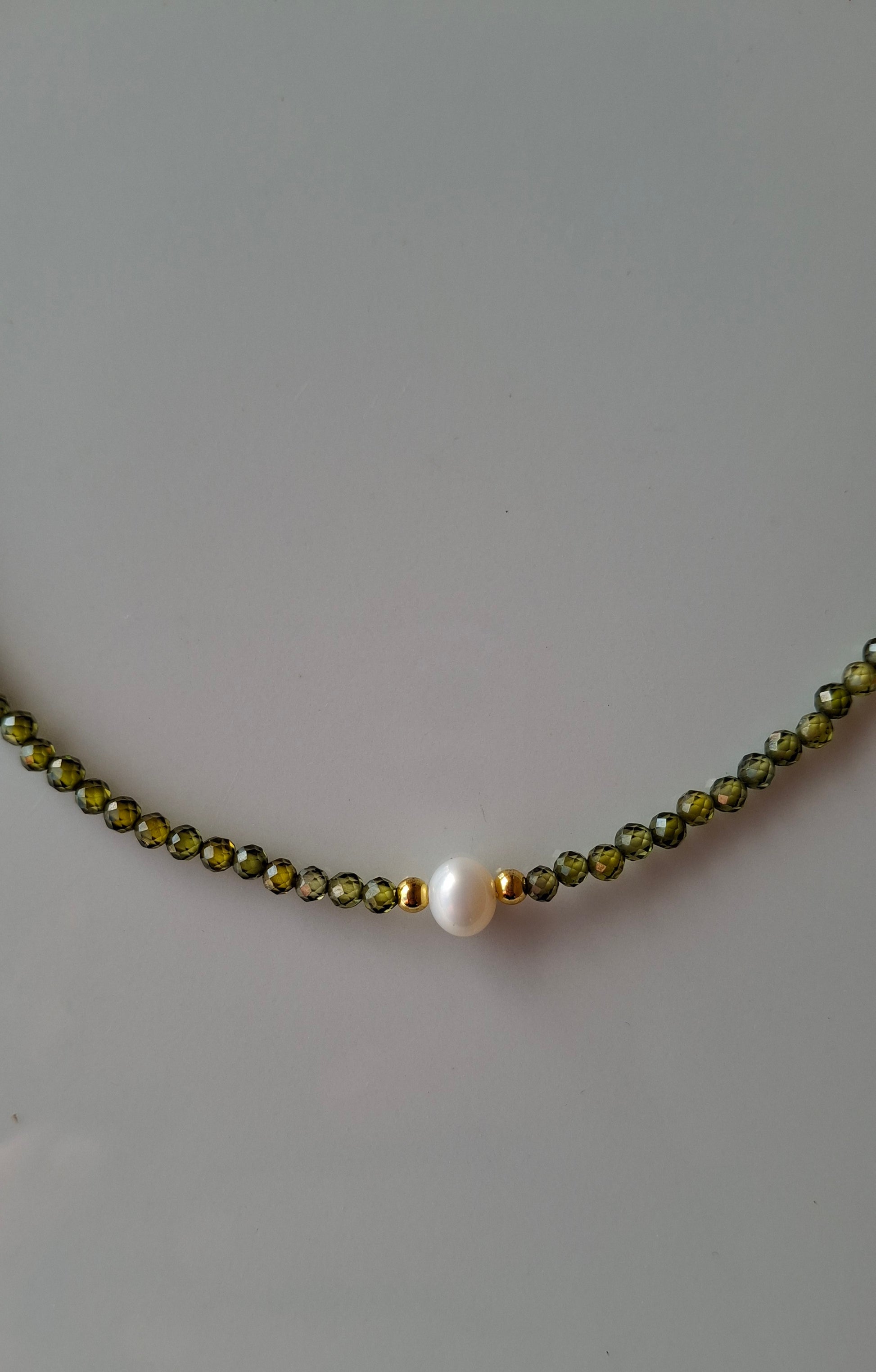Girocollo realizzato con zirconi naturali verde chiaro e perla di fiume bianca centrale.