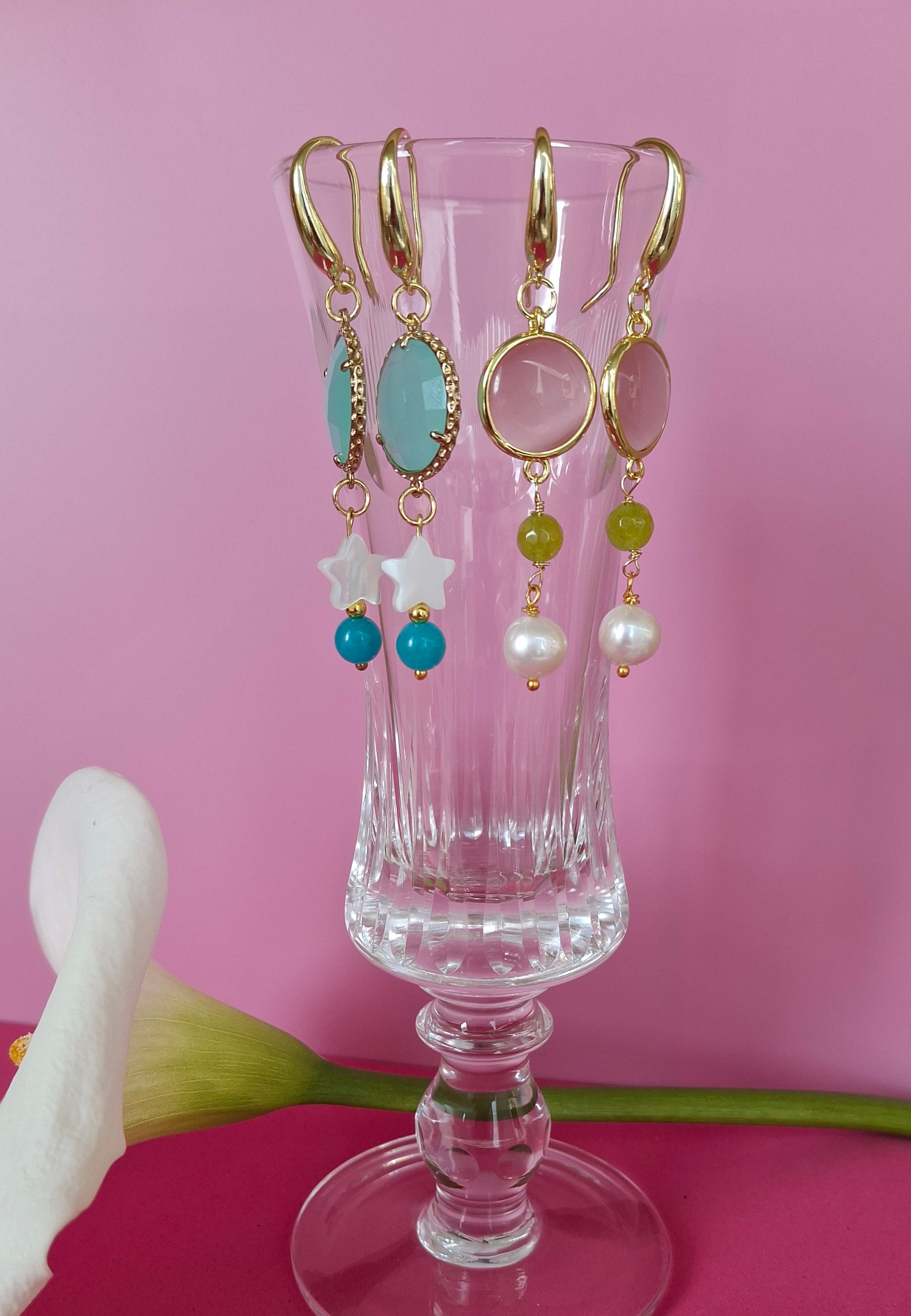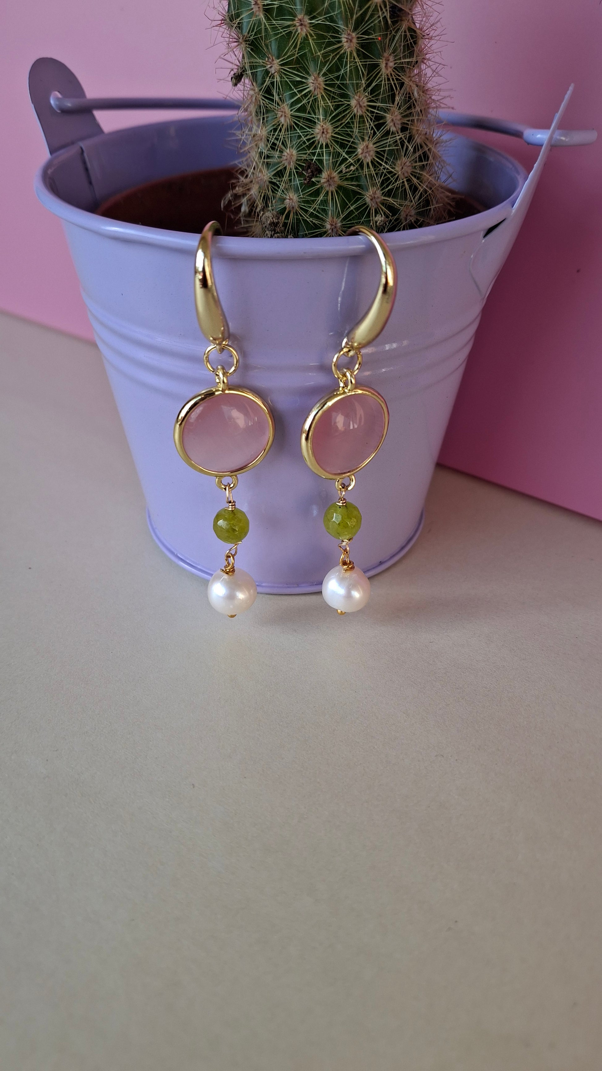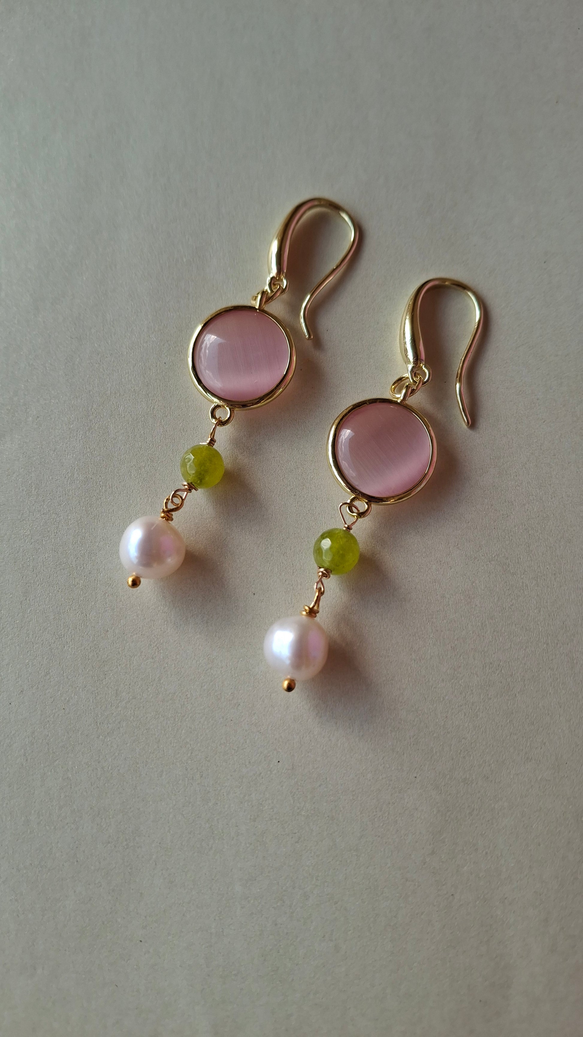 Orecchini realizzati con pietra occhio di gatto rosa, giada verde acero e perle di fiume bianco.